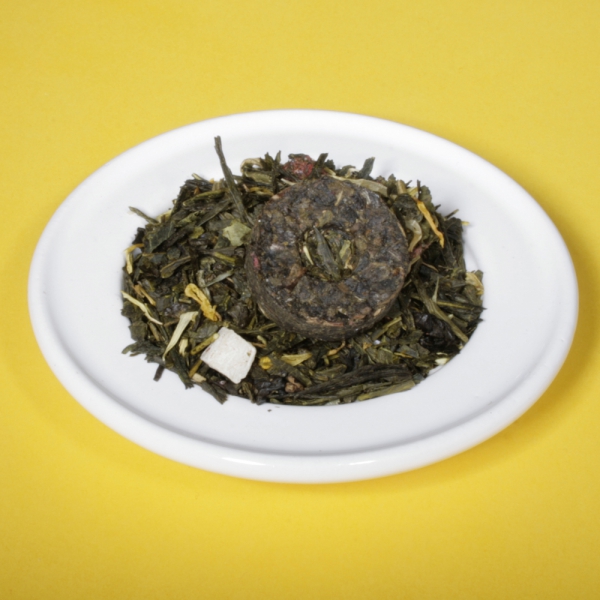 Zutaten: Grüner Tee China Sencha, - Ming Mee, weißer Tee Pai Mu Tan, grüner Tee China Gunpowder,- China Wu Lu, Aroma, rote und schwarze Johannisbeeren, Ginsengwurzel, Kornblumenblüten, Aprikosenstücke (Aprikose, Reismehl)(1%.)
