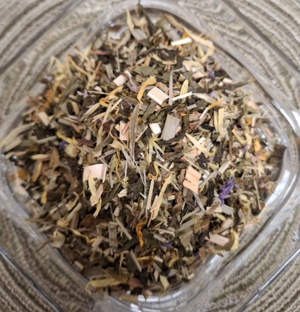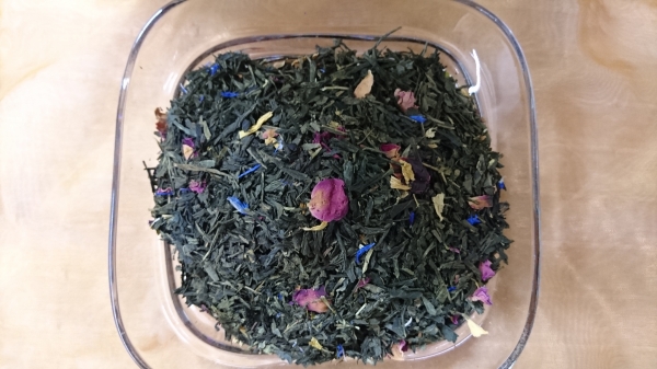 Zutaten: Grüner Tee China Sencha, Aroma, Weidenröschenkraut, Sonnenblumenblüten, Rosenblütenblätter, Ringelblumenblüten