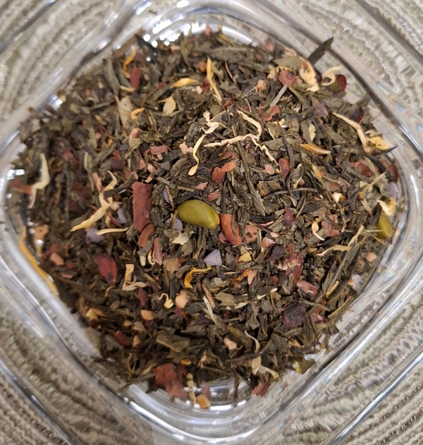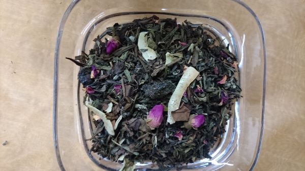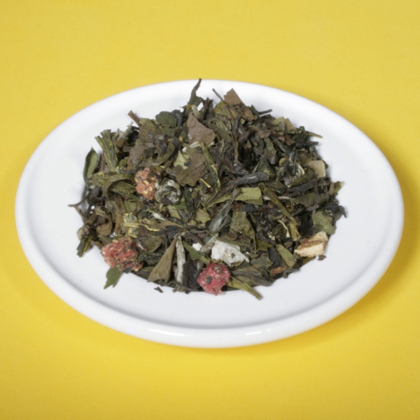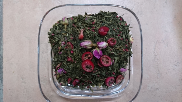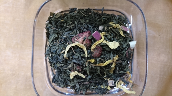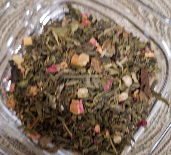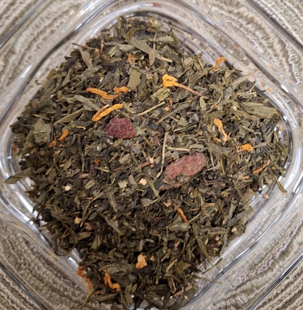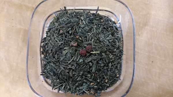 Zutaten: grüner Sencha(87%), Rosenknospen, gefr.-getr. Himbeerstücke, Aroma, gefr.-getr. Cranberryscheiben.