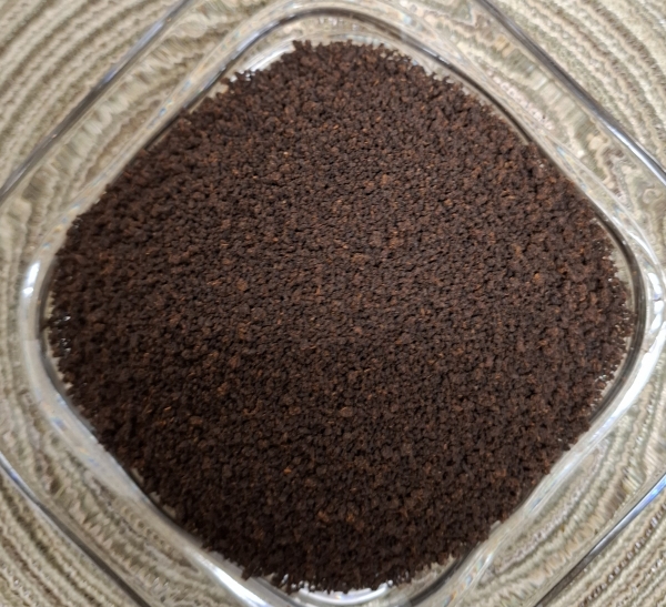 Ein Assam Broken , der nach der CTC-Methode - Crushing-Tearing-Curling (=zermahlen-zerreißen-rollen) hergestellt wurde; kugeliges Blatt, dunkelabgießender, malziger, kräftiger Tee.