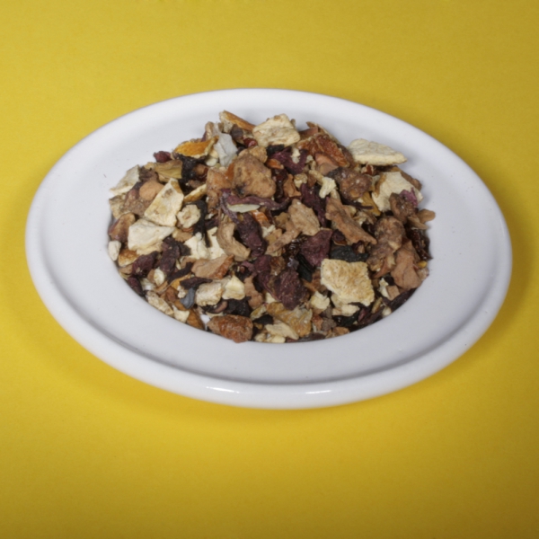 Apfelstücke, Aroma, Hibiscusblüten, Korinthen, Hagebuttenschalen, Mandelflakes, Nelken.