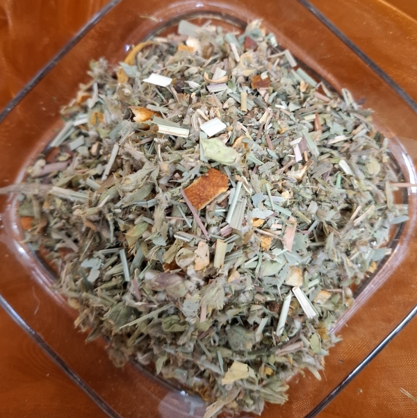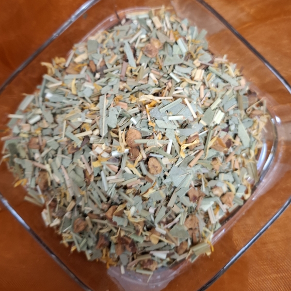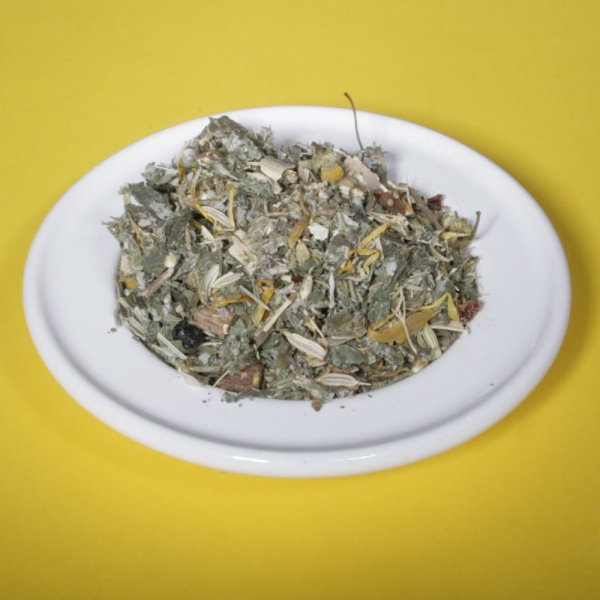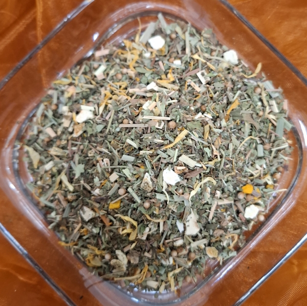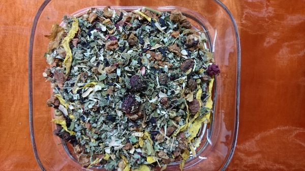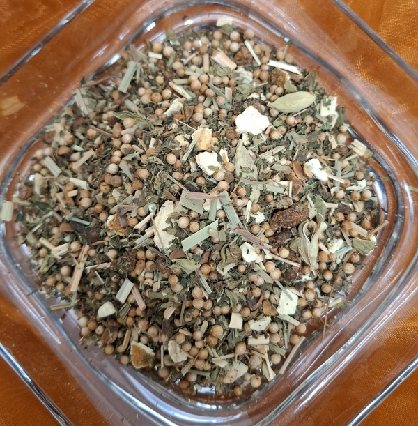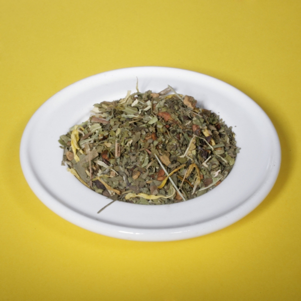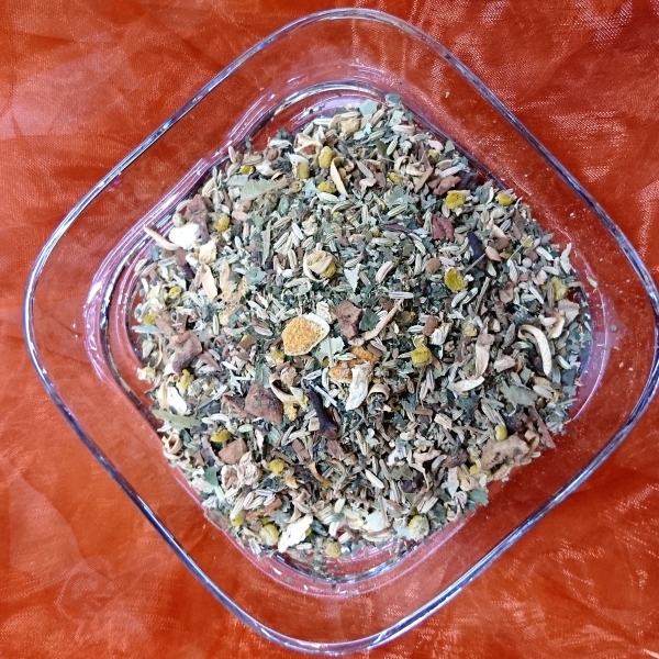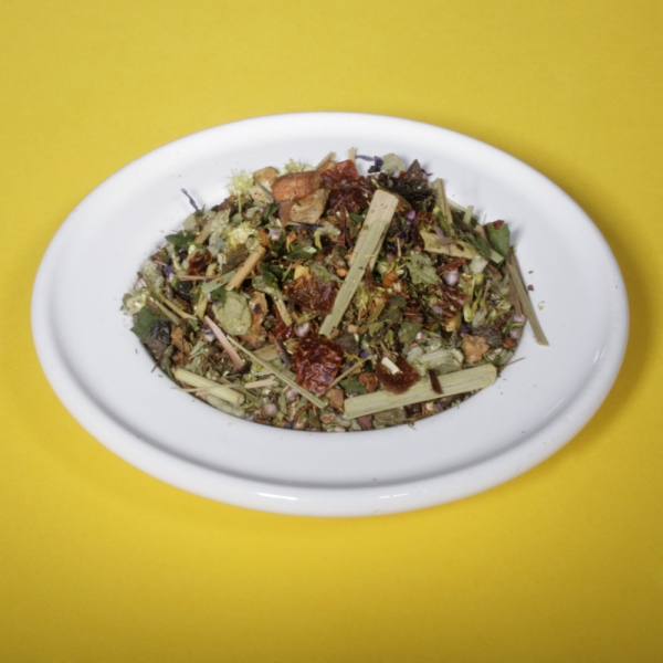 Zutaten: Nanaminze, Kurkuma, Orangenschalen, Lemongras, Koriander, Quendelkraut, Rosmarinblätter, Löwenzahnkraut, Frauenmantelkraut, Ringelblumenblüten