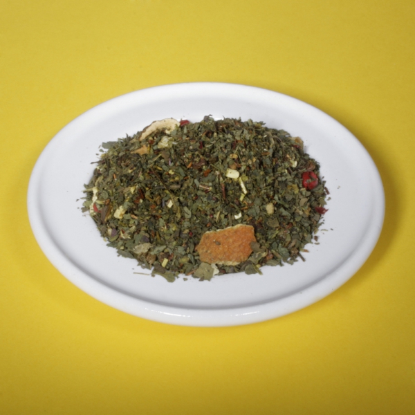Zutaten: Griechische Bergkräuter, Lemongras, Fenchel, Orangenschalen, Eukalyptusblätter, Zitronenschalen, Nanaminze, Moringablätter, Gojibeeren, Sanddornbeeren, Sonnenblumenblüten