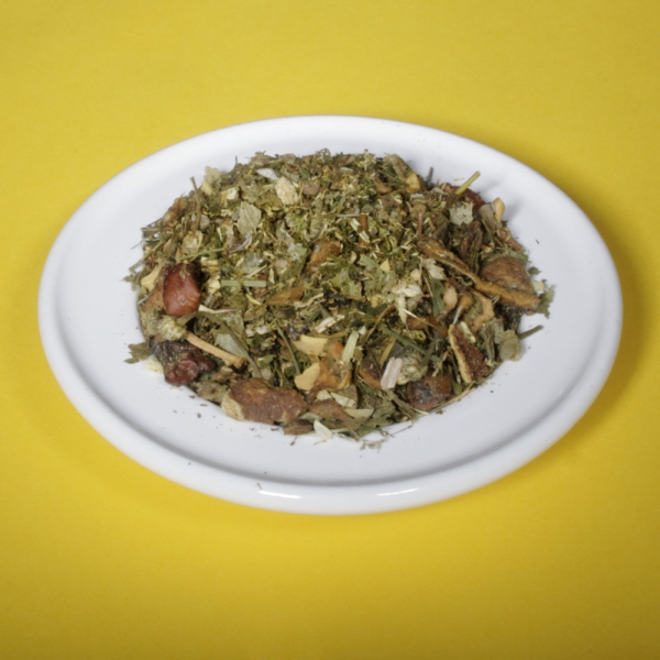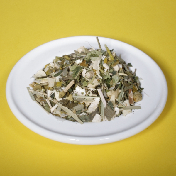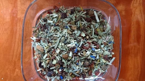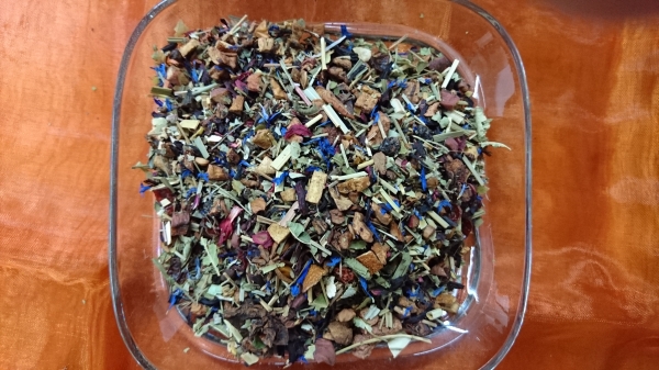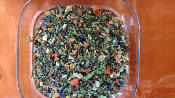Zutaten: Apfelstücke, Fenchel, China Bambusblätter, Ingwerstücke, Orangenschalen, Karottenflocken, Zimtstücke, Brombeerblätter, Eukalyptusblätter, schw. Pfeffer, Rosenblüten, weiße Rosenknospen, Basilikum, Himbeerblätter, Lavendelblüten, Ringelblumenblüten, Rote-Beete-Stücke