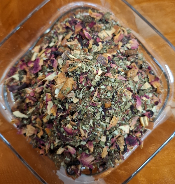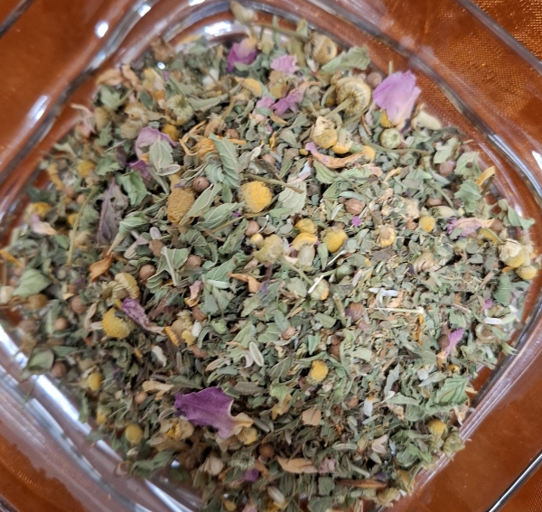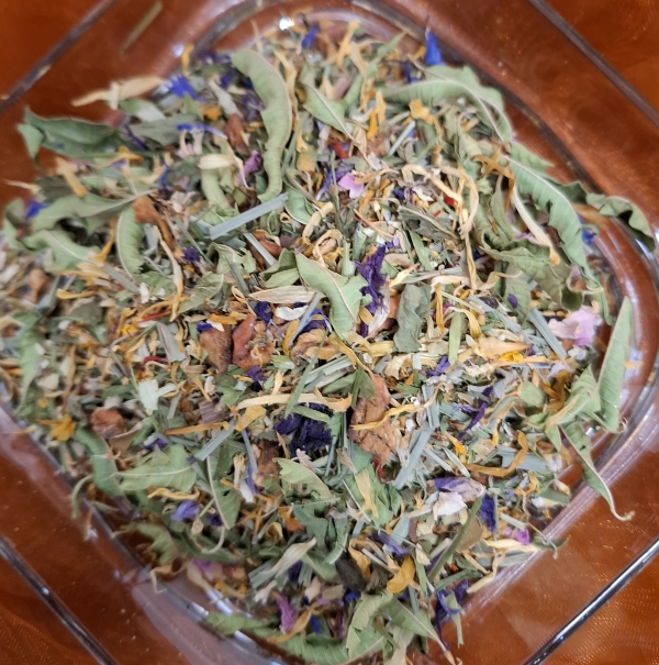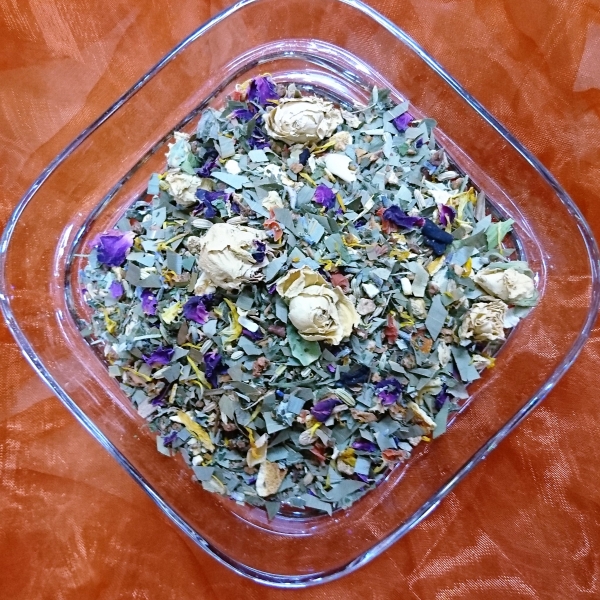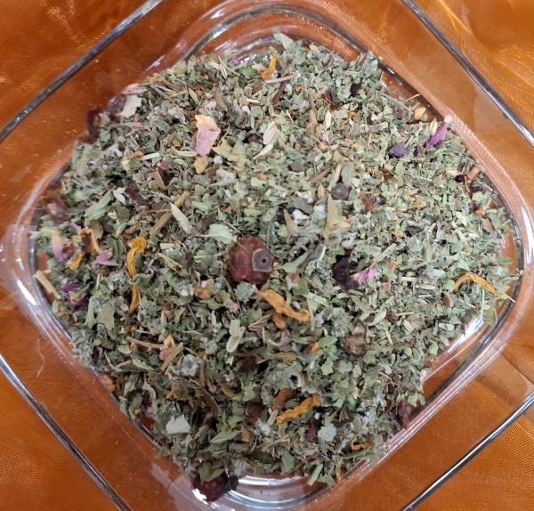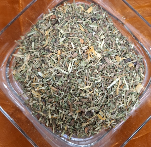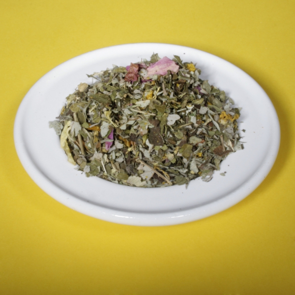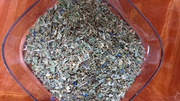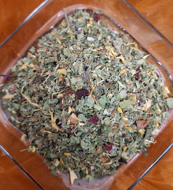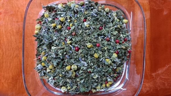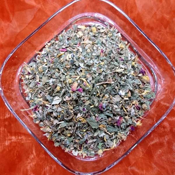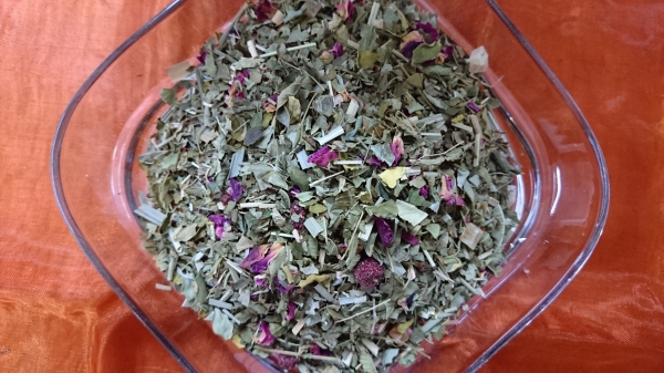 Zutaten: Brombeerblätter, Kamillenbläten, Melisse, Pfefferminze, Erdbeerblätter, Zitronengras, Haselnussblätter, Ringelblumenblätter, Rosenblüten, Lavendelblüten
