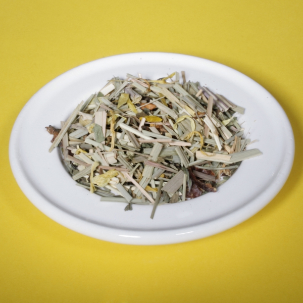 Lemongras, Hagebuttenschalen, Pfefferminzblätter, Grüner Tee (KBA), Ringelblumenblüten.