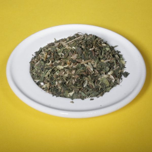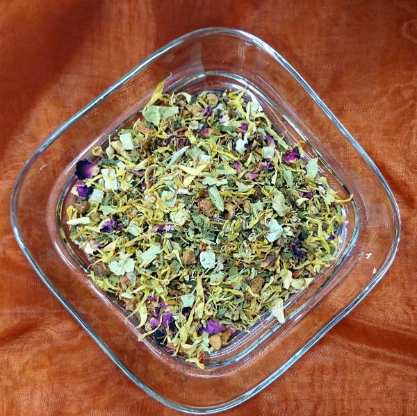 Zutaten:Fenchel, Pfefferminzblätter, Kamillenblüten, Tulsikraut, Koriandersaat, Melissenblätter, Rosenblütenblätter, Ringelblumenblüten, Orangenblüten, Passionsblumenkraut.