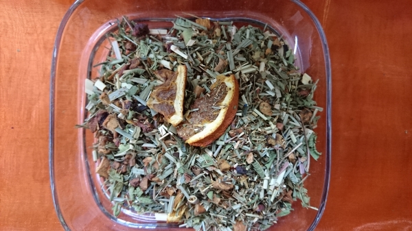 Zutaten: Fenchel, Kamillenblüten, Orangenschalen, Apfelstücke, Zimtstücke, Ingwerstücke, Lindenblüten, Brennessel- und Walderdbeerblütter, Orangenblüten, Nelken